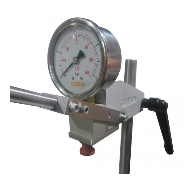 The HOFER Pressure Gauge is used to measure pressure of can or bottle. The gauge is placed on top of the can and the piercing needle is forced through the top of the can.